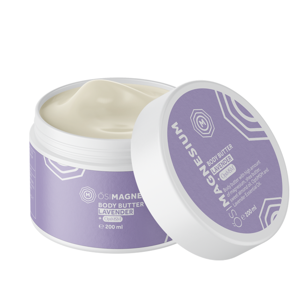 Fragrant, creamy body butter with lavender essential oil! Formulated with pure Ősi Magnesium concentrate and pain-relieving, joint-protecting OptiMSM, this soft-textured body butter is enriched with fragrant lavender essential oil to relax all the senses. This quick and easy absorbing skin care contains 35% magnesium, shea butter and sweet almond oil.
